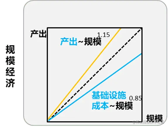 首先,可以解释为规模经济性,简单地说,随着生产规模(云计算)扩大,平均单位产出(服务收益)成本(基础设施成本)趋于下降。英国的杰弗里·韦斯特研究城市的人口和产业的发展规律,总结为规模经济体的产出呈超线性,而成本遵循亚线性规律,如下图所示。
