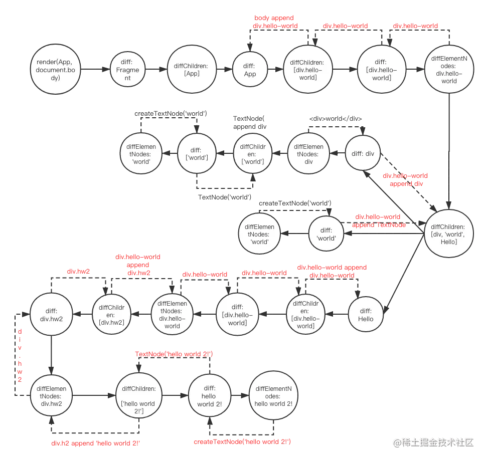 如下图,其基本的调用流程如下,实线代表函数调用,虚线表示返回及dom的处理。我们可以看到,Preact从App节点开始,使用深度搜索的方式,递归调用diffChildren、diff、diffElementNodes三个函数,完成节点的diff、虚拟节点的创建、dom的生成,最终将内容插入到页面中。