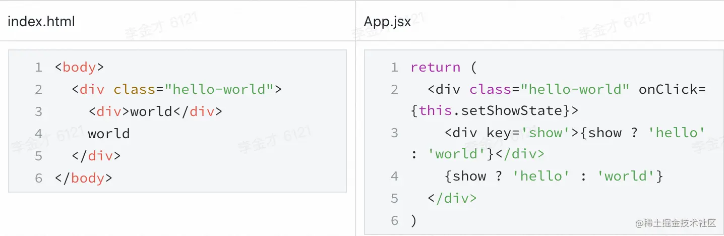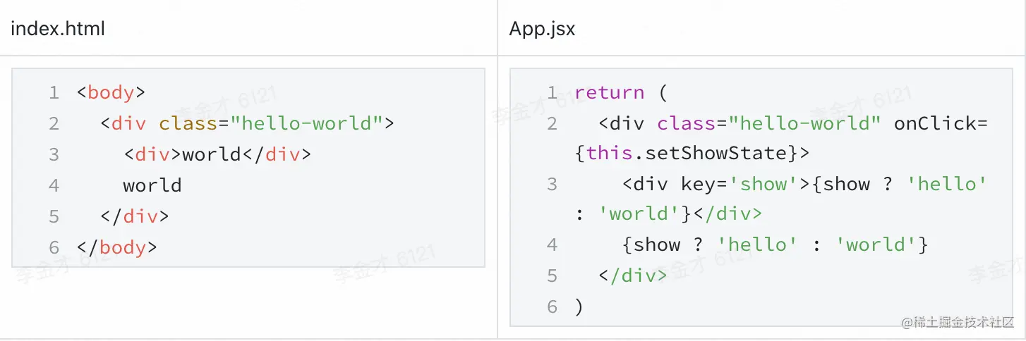 Preact的diff流程,采取深度搜索比较的形式,从上到下,diff、diffChildren、diffElementNode循环调用,完整整个vnode dom tree的比较和处理。以如下的一个例子,我们看下初始化阶段其基本的diff处理流程。