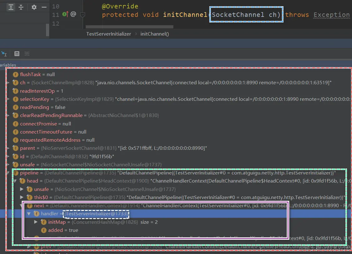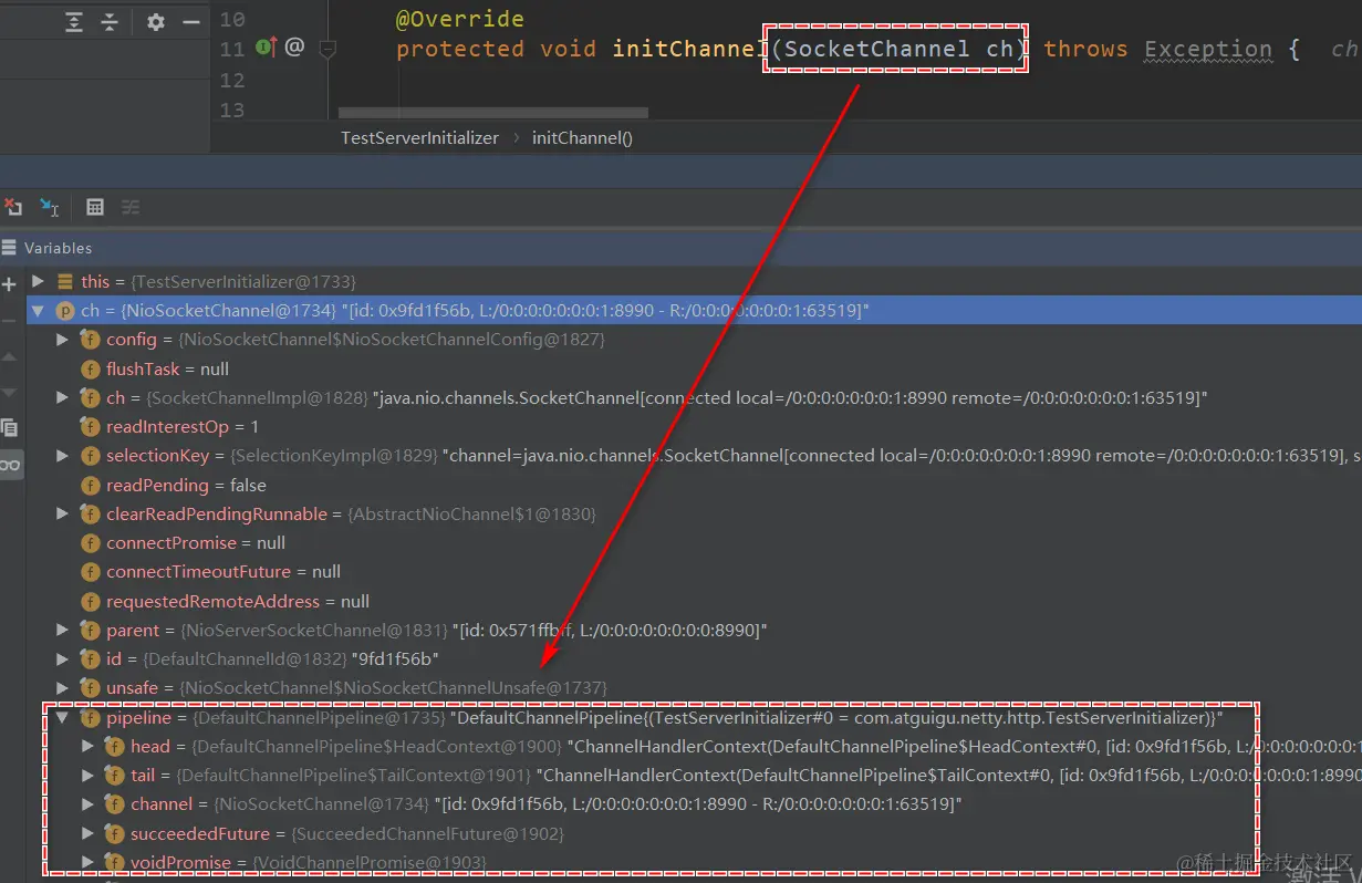 在调试模式中也可以发现 SocketChannel 中对应着一个ChannelPipeline
