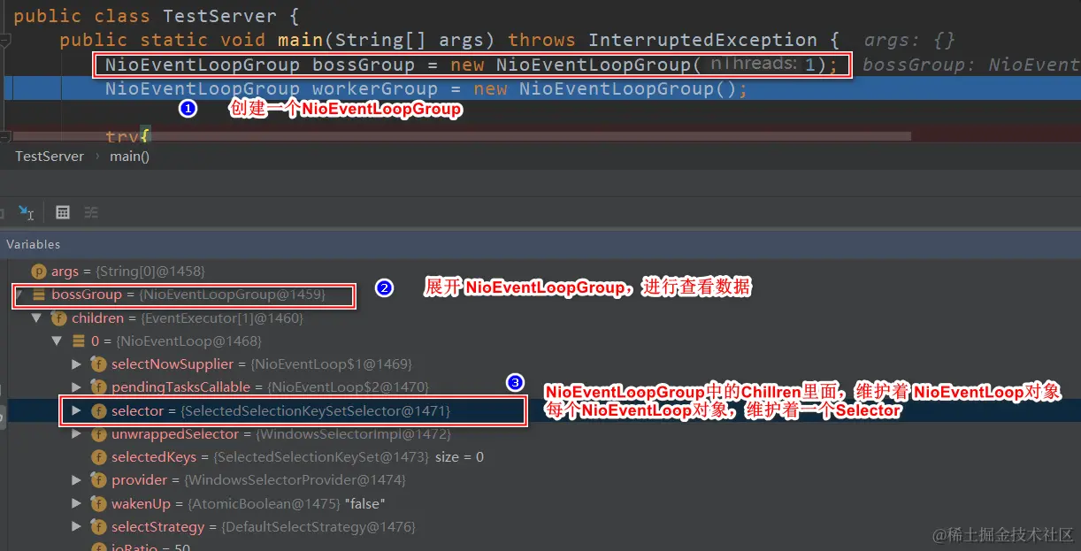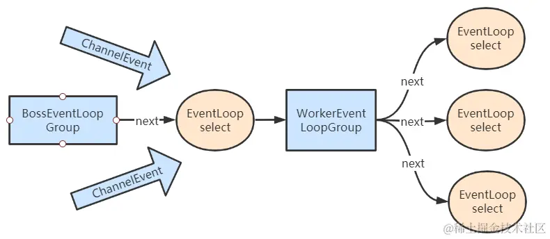 WorkerEventLoopGroup会由next选择其中一个EventLoop来将这个SocketChannel注册到其维护的Selector并对其后续的IO事件进行处理