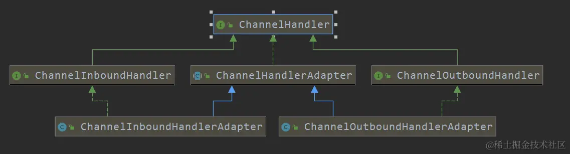 ChannelHandler 本身并没有提供很多方法,因为这个接口有许多的方法需要实现,方便使用期间,可以继承它 的子类