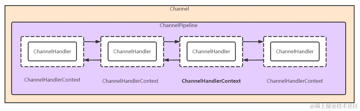 一个Channel包含了一个ChannelPipeline,而ChannelPipeline中又维护了一个由ChannelHandlerContext组成的双向链表,并且每个ChannelHandlerContext中又关联了一个ChannelHandler