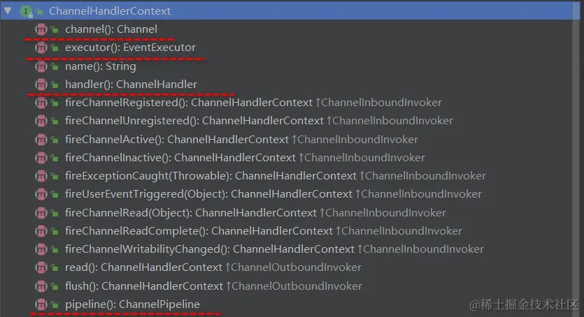 即 ChannelHandlerContext 中 包 含 一 个 具 体 的 事 件 处 理 器 ChannelHandler , 同 时 ChannelHandlerContext 中也绑定了对应的 pipeline 和 Channel 的信息,方便对 ChannelHandler 进行调用.