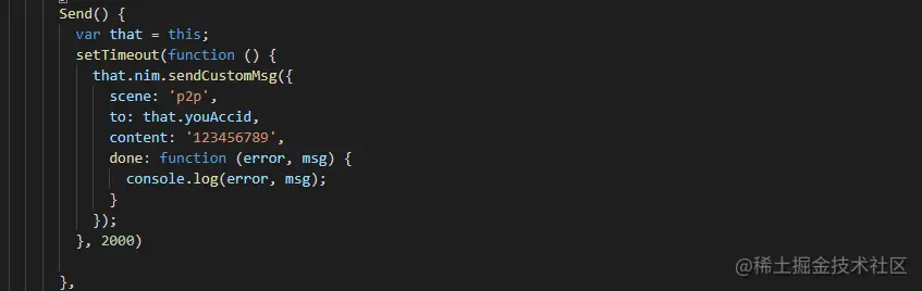 由于没有点击事件和界面图 这边就写成两秒后自动发送内容为‘123465789’的内容
