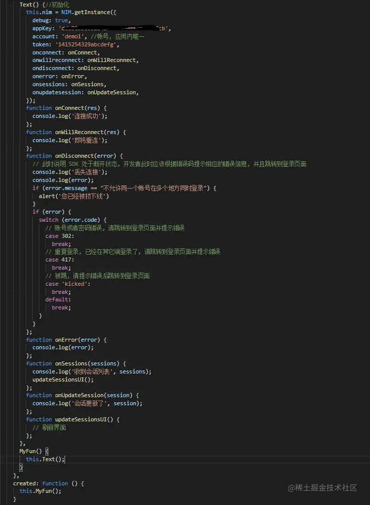 this.nim = NIM.getInstance({ debug: true, appKey: '云信key', account: 'demo1', //帐号, 应用内唯一 token: '1415254329abcdefg', onconnect: onConnect, onwillreconnect: onWillReconnect, ondisconnect: onDisconnect, onerror: onError, onsessions: onSessions, onupdatesession: onUpdateSession, }); function onConnect(res) { console.log('连接成功'); }; function onWillReconnect(res) { console.log('即将重连'); }; function onDisconnect(error) { // 此时说明 SDK 处于断开状态, 开发者此时应该根据错误码提示相应的错误信息, 并且跳转到登录页面 console.log('丢失连接'); console.log(error); if (error.message == "不允许同一个帐号在多个地方同时登录") { alert('您已经被挤下线') } if (error) { switch (error.code) { // 账号或者密码错误, 请跳转到登录页面并提示错误 case 302: break; // 重复登录, 已经在其它端登录了, 请跳转到登录页面并提示错误 case 417: break; // 被踢, 请提示错误后跳转到登录页面 case 'kicked': break; default: break; } } }; function onError(error) { console.log(error); }; function onSessions(sessions) { console.log('收到会话列表', sessions); updateSessionsUI(); }; function onUpdateSession(session) { console.log('会话更新了', session); }; function updateSessionsUI() { // 刷新界面 };