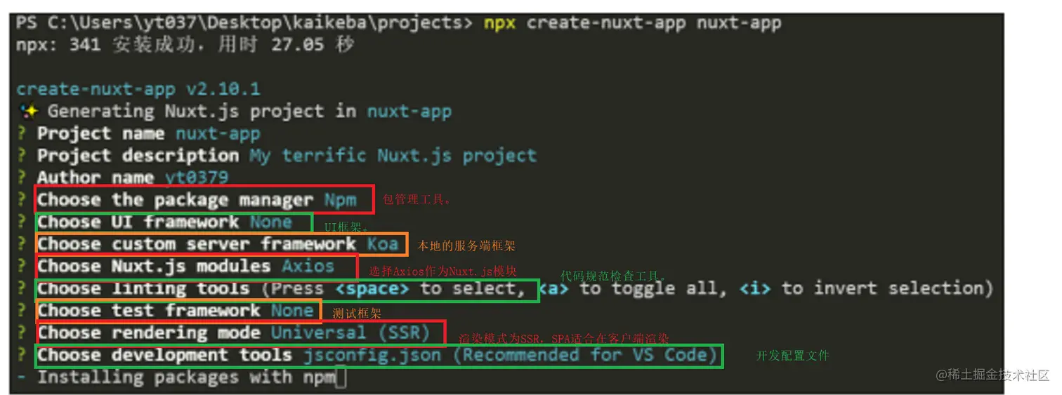 在cmd窗口中输入npx create-nuxt-app bien_test命令,其中bien_test为工程名称,按下回车键后过程如下:
