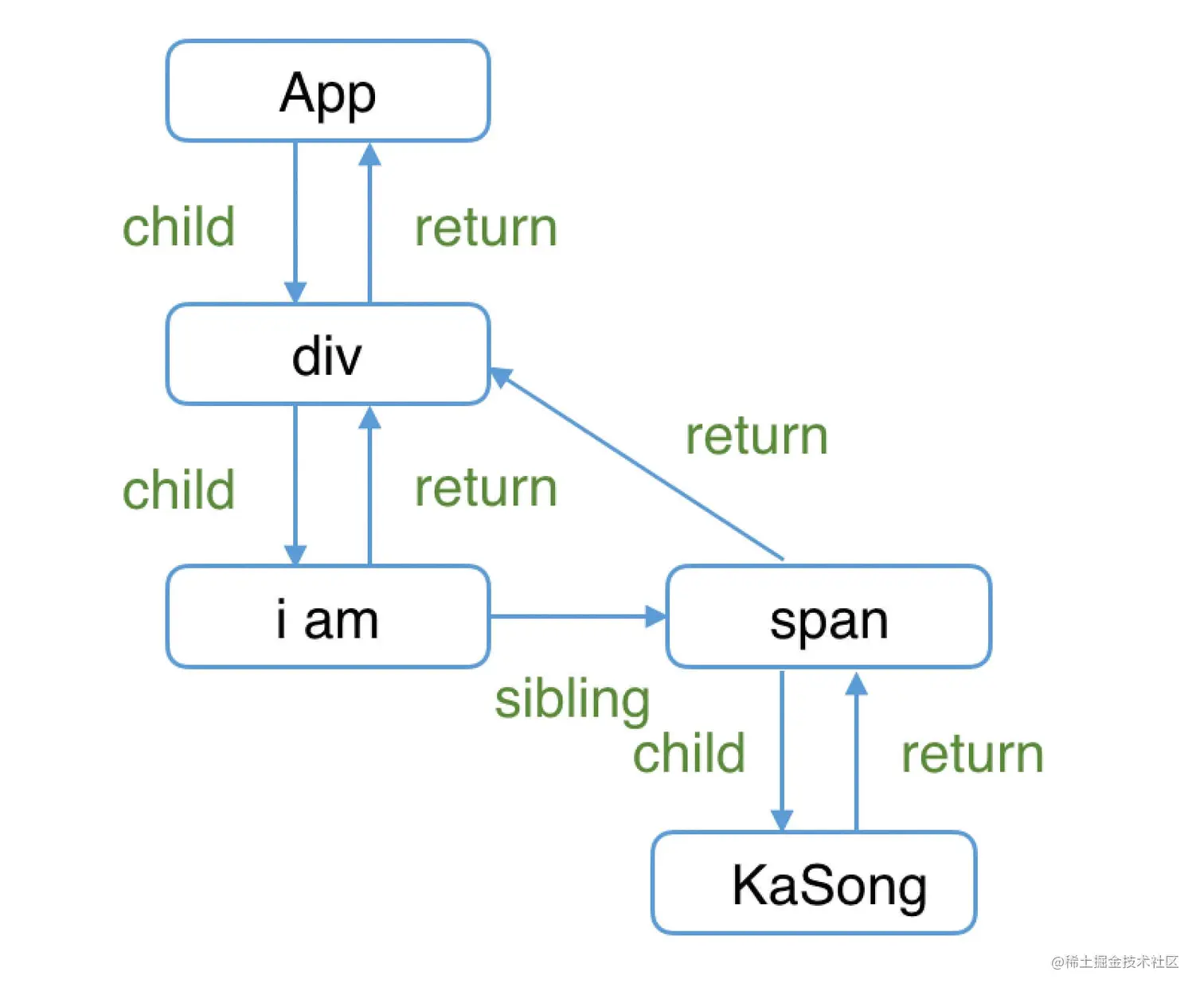 以上流程中, beginWork 和 completeWork 并没有先后顺序,请看下图(图片来源于卡老师的 React技术揭秘):