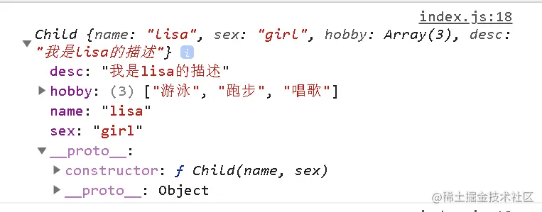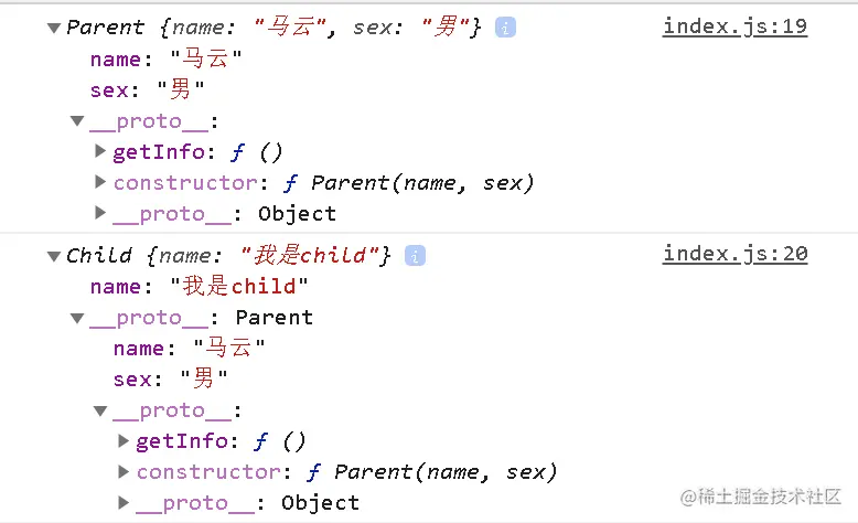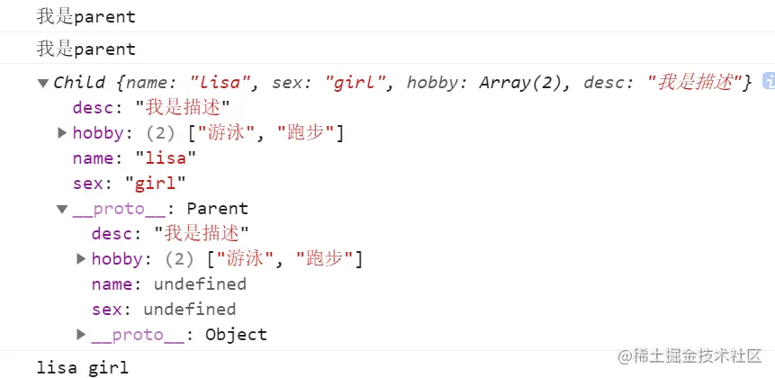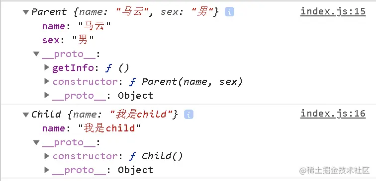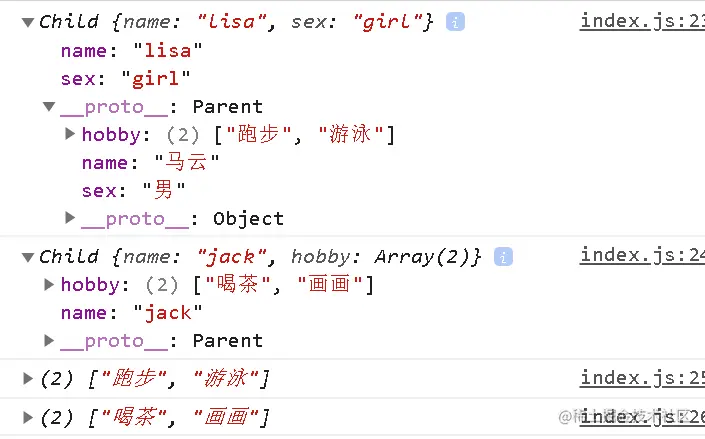 有没有看出问题? 我们想要继承父类构造函数里的属性和方法采用的是构造继承,也就是复制一份到子类实例对象中,而此时由于调用了new Parent(),所以Child.prototype中也会有一份一模一样的属性,正常情况下,我们自己没有该属性的时候才会使用原型的属性和方法,但是原型的属性和方法和自己的一模一样。也就是说不可能使用原型的属性和方法。所以就会造成一种浪费资源。