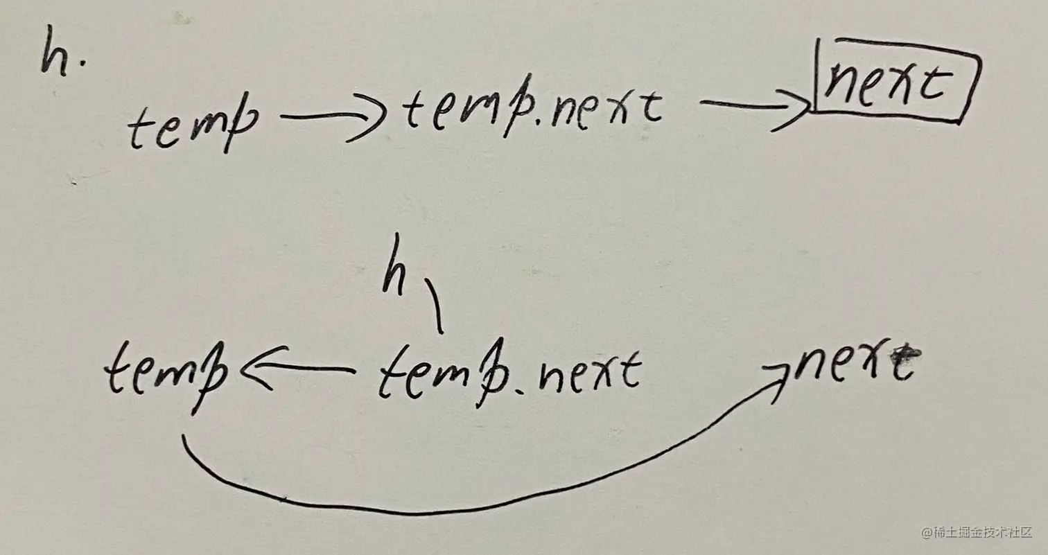交换链表中相邻节点的值,我们先从中间入手,有前 pre 有后 next,将当前节点设为 temp,那将 temp 和 temp.next 进行交换,即为将 pre 指向 temp.next,再将 temp.next.next 指向 next,再将 temp.next 指向 temp,即完成交换。如下图所示。