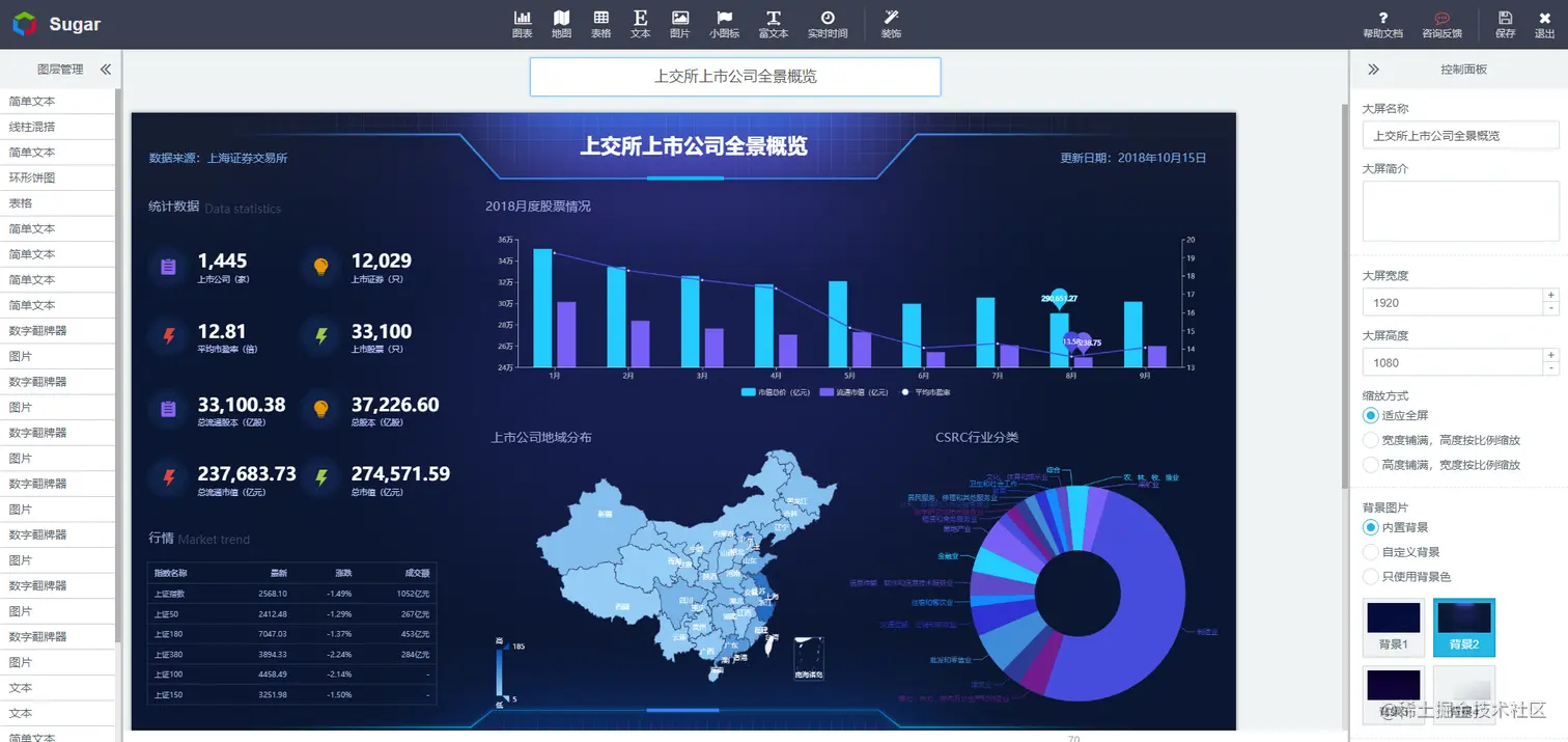 帆软是业内做报表比较久的一家公司,使用类excel风格的界面,可添加图表和数据源,也可实现大屏效果。