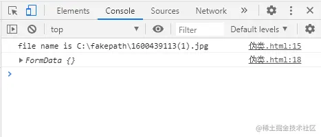 可以发现路径是一个假的,也就是说在浏览器无法获取文件真实存放的位置.** FromData **打印出来的是一个空对象,但不是说它里面的内容是空的,只是他对前端开发人员是透明的,无法查看,修改,删除里面的内容,只能用append增加字段.