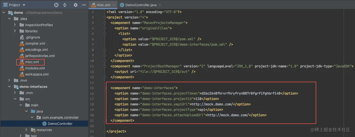 <component name="项目名"> <option name="projectToken">YApi中项目的token</option> <option name="projectId">YApi中项目的id</option> <option name="yapiUrl">部署的YApi地址</option> <option name="projectType">api</option> <option name="attachUploadUrl">上传java类zip的url</option> </component>