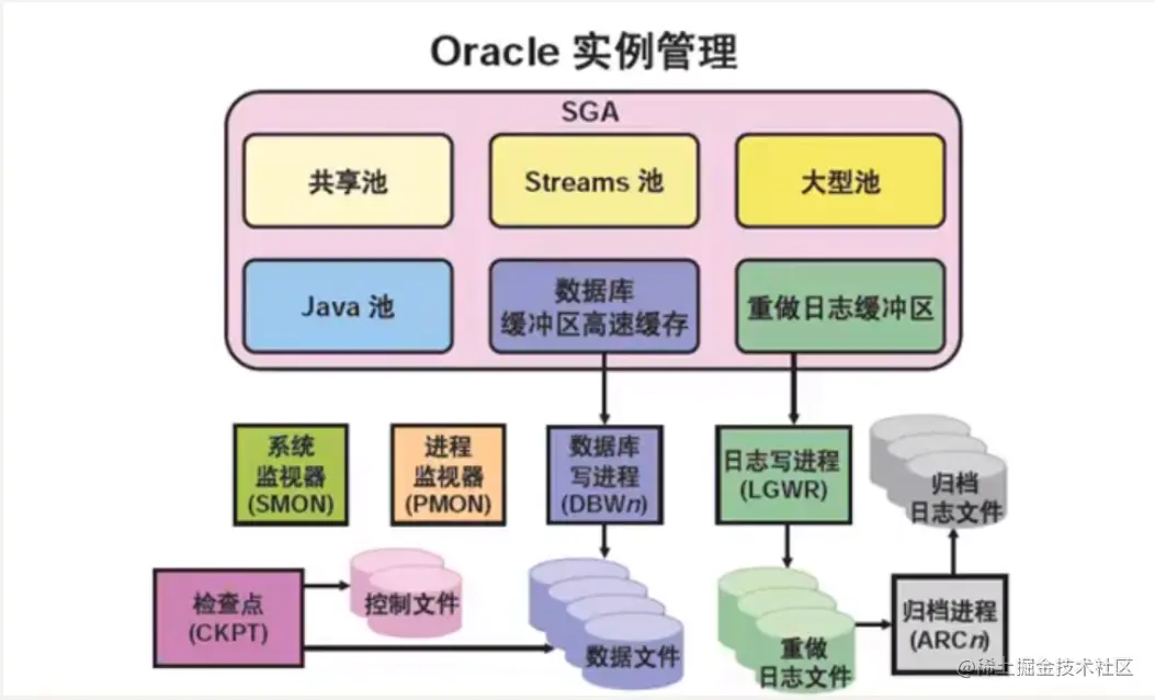 Oracle数据库服务器由Oracle数据库和Oracle实例组成,Oracle实例由系统全局区SGA的内存结构和后台进程组成。这些后台进程可以处理运行实例时所涉及到的大量后台任务。