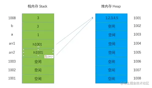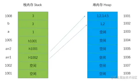 值存在于堆内存中(散列结构),指针(地址)存在于栈内存中