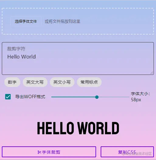 先将字体文件转换为 arrayBuffer,传递给 opentype.js 的 parse 函数得到字体文件的解析结果。 使用 stringToGlyphs(string) 方法获取需要裁剪的字形信息列表。结合字体名等信息 new 一个新的 Font 就能得到字体子集。最后会下载 ttf和woff两种格式的子集文件。