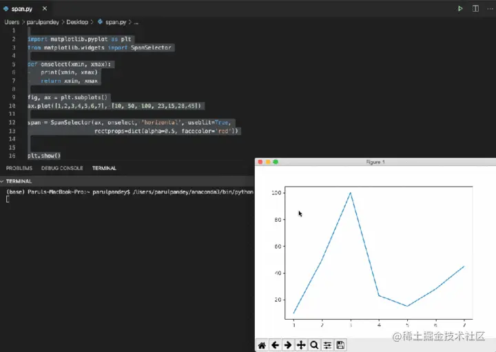 下面是代码,首先创建一个基本折线图作为例子。然后,我们调用SpanSelector方法并使用它来选择一个区域,然后在该区域中显示最大值和最小值。