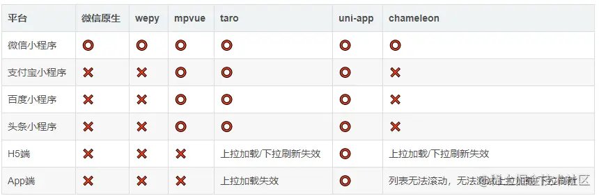⭕ 表示支持且功能正常,❌ 表示不支持,其它则表示支持但存在部分bug或兼容问题 wepy 2.0 宣称版已支持其他家小程序,本测试基于wepy官网指引安装的wepy-cli默认版本为1.7.3,尚不支持多端 chameleon尝鲜版宣称支付宝、百度小程序,本测试基于chameleon官网指引安装的chameleon-tool默认版本为0.1.1,尚不支持其它小程序 通过这个简单的例子可以看出,跨端支持度测评结论:uni-app > taro > chameleon > mpvue >wepy、原生微信小程序