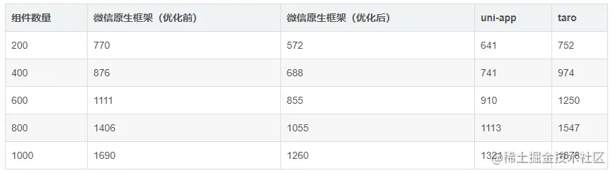微信原生框架耗时主要在setData调用上,开发者若不单独优化,则每次都会传递大量数据;而 uni-app、taro 都在调用setData之前自动做diff计算,每次仅传递有变化的数据。