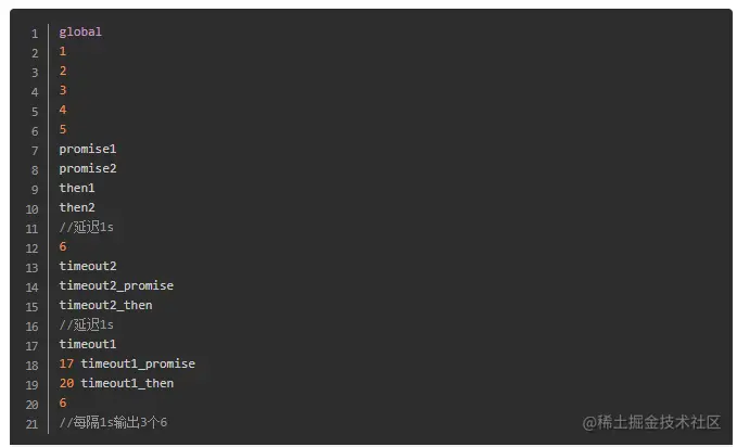 11)、继续回过头来执行宏任务队列,此时是执行延时为2s的第一个setTimeout和for循环中第二次循环的那个setTimeout,跟上面一样,前者是第一个被push进来的,所以它先执行。这里会延时1秒(原因下面会解释)分别输出“timeout1”和“timeout1_promise”,但发现了里面也有一个then,于是push到then微任务队列并立即执行,输出了"timeout1_then"。紧接着执行for中第二次循环的setTimeout,输出6。注意这三个几乎是同时被打印出来的。他们分别是第十一到十三个输出。