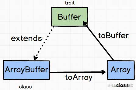 可变集合的内容明显要比不可变集合要更复杂一些,主要是多了 Buffer (缓冲)的内容。在实际开发中我们常用的有 ArrayBuffer 和 ListBuffer。