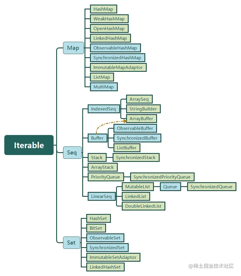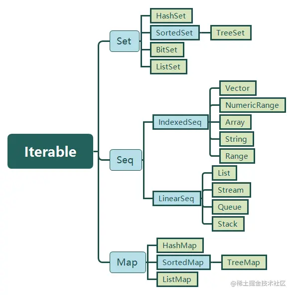 Set 和 Map 都提供有序方式的集合 SortedXXX 。Java 中 List 归属于 Set 集合下,在 Scala 则属于 Seq 的线性序列部分。