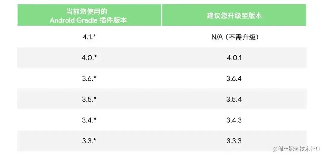 但是,并不是所有开发者都能够使用最新的版本,一些项目中可能会依赖老版本的 Gradle 或者代码库,而它们与 4.1 版本的 Android Gradle 插件有兼容性问题。