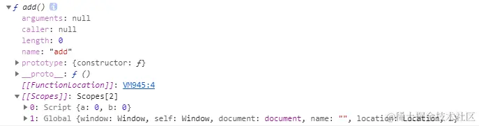 - add函数的[[Scopes]]只有一个内容就是Global,a与b两个变量挂在add函数的Global作用域上因为他们是随时可用的
