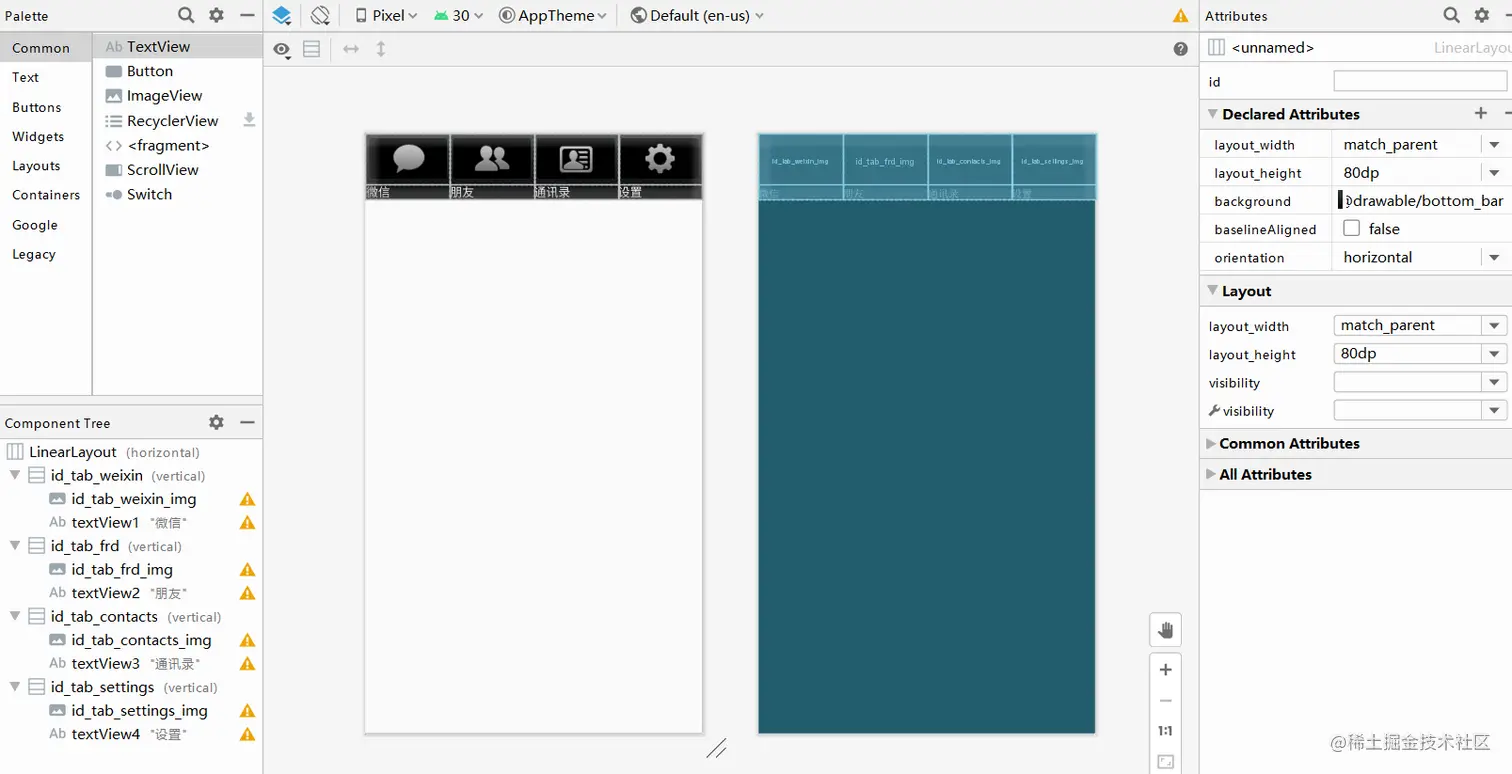 先创建四个xml文件,分别取名为tab01~04,用来保存中间页面文字以及位置,最后在 系统生成的activity_main.xml文件里对整个FrameLayout进行布局,并导入之前创建的 top和button两个文件,效果如下: