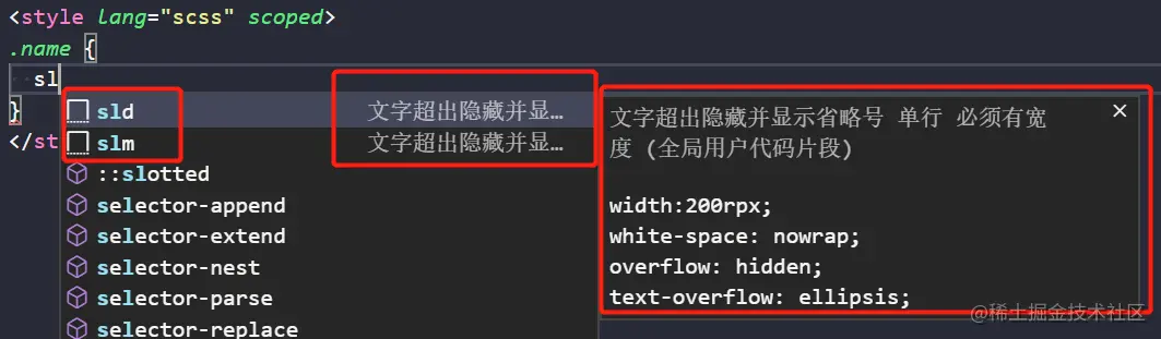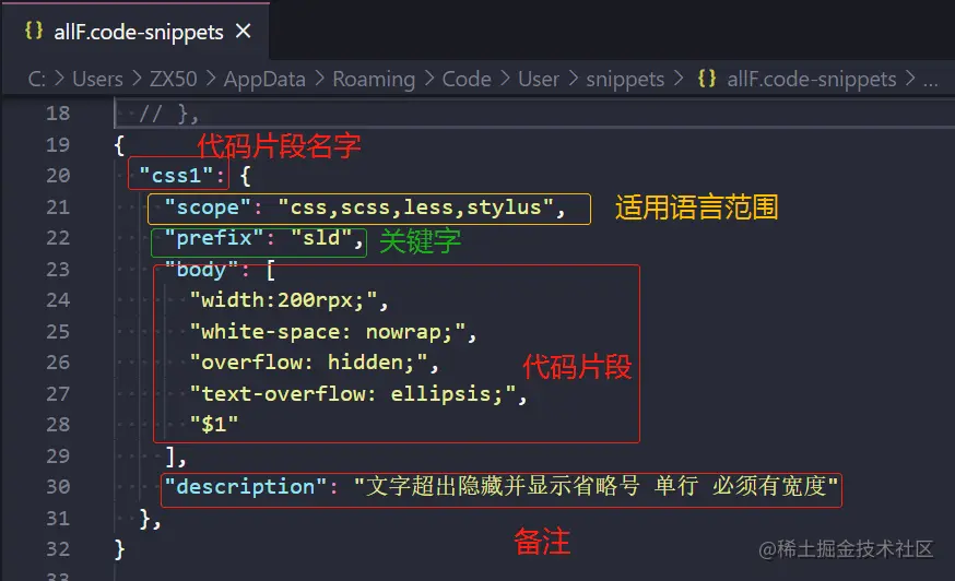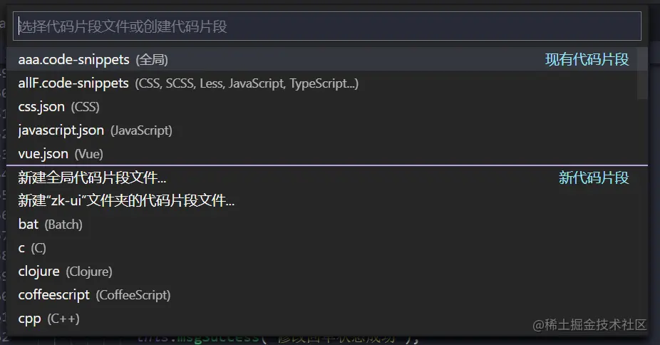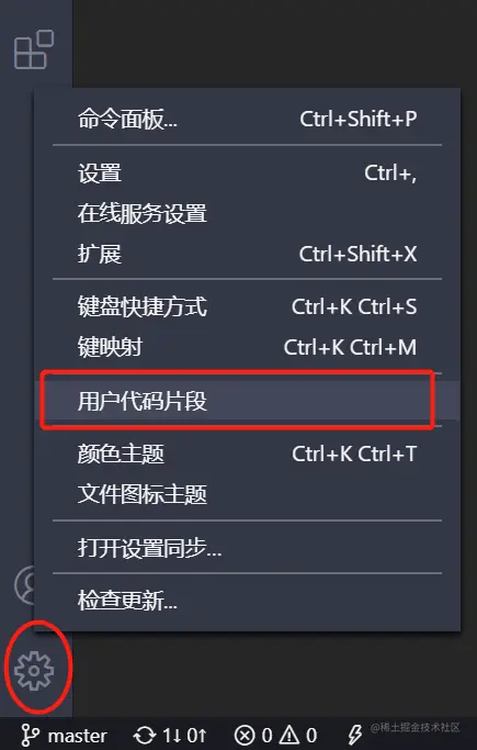 用户代码片段(工具vscode格式) 暮雪之寒 2020-10-14 1,480 阅读1分钟 1.设置--用户代代码片段 2.然后----看到分割线上面的就是自己设置的代码片段,下面的有滚动条让你自己选择在什么文件设置常用的代码片段 3.写自己的代码片段 4.使用方式很简单,在指定的文件,输入自己设置的关键字就会出现,提示框,你选择对应点击回车,就出来了 5.自己写好的用户代码片段有css,js,vue模板