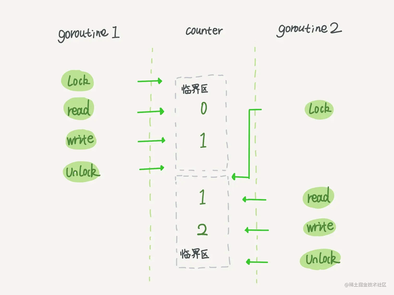 - 临界区是需要每个 goroutine 主动遵守的,说白了就是每个 goroutine 的代码都存在 Lock。