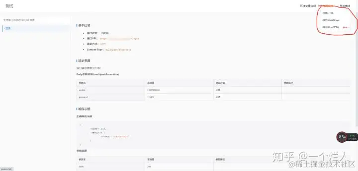 这就是接口文档的格式如何编写的了,我这里不是用自己手写的,而是用的一款叫apipost的接口测试和接口文档生成工具生成的,它还可以生成html和markdown格式的接口文档。