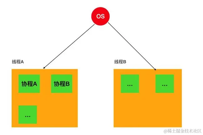 由于协程是应用层实现的,一个线程内多个协程对于操作系统是感知不到的: