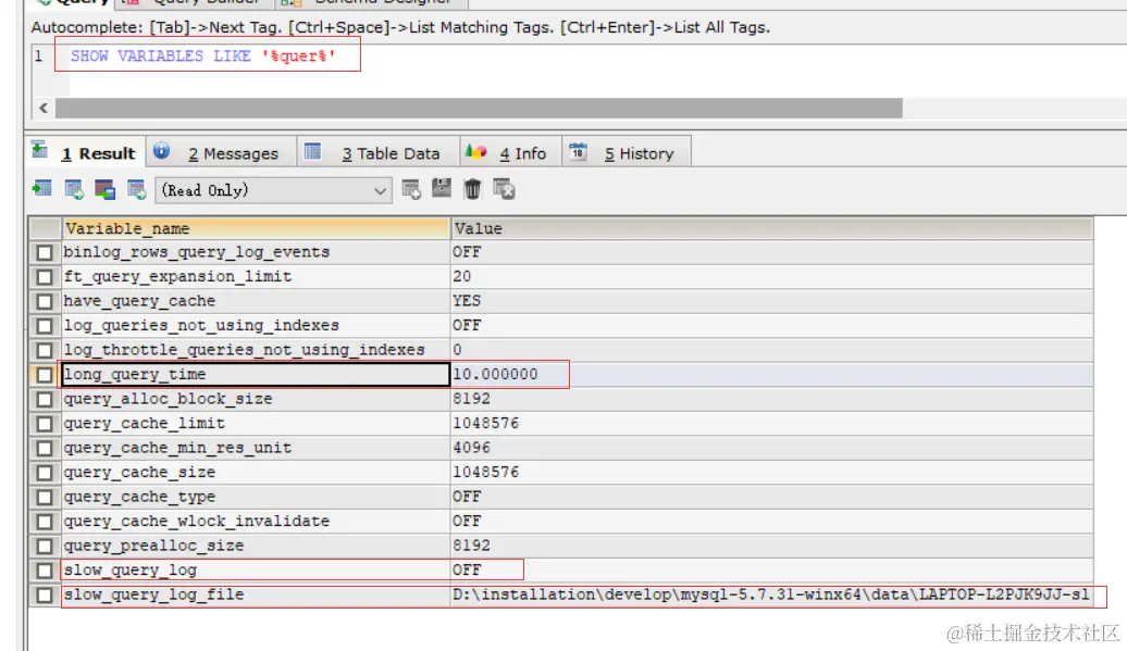上图是查询慢日志的设置,分别是查询的时间,开启慢查询,慢查询的日志存储地址
