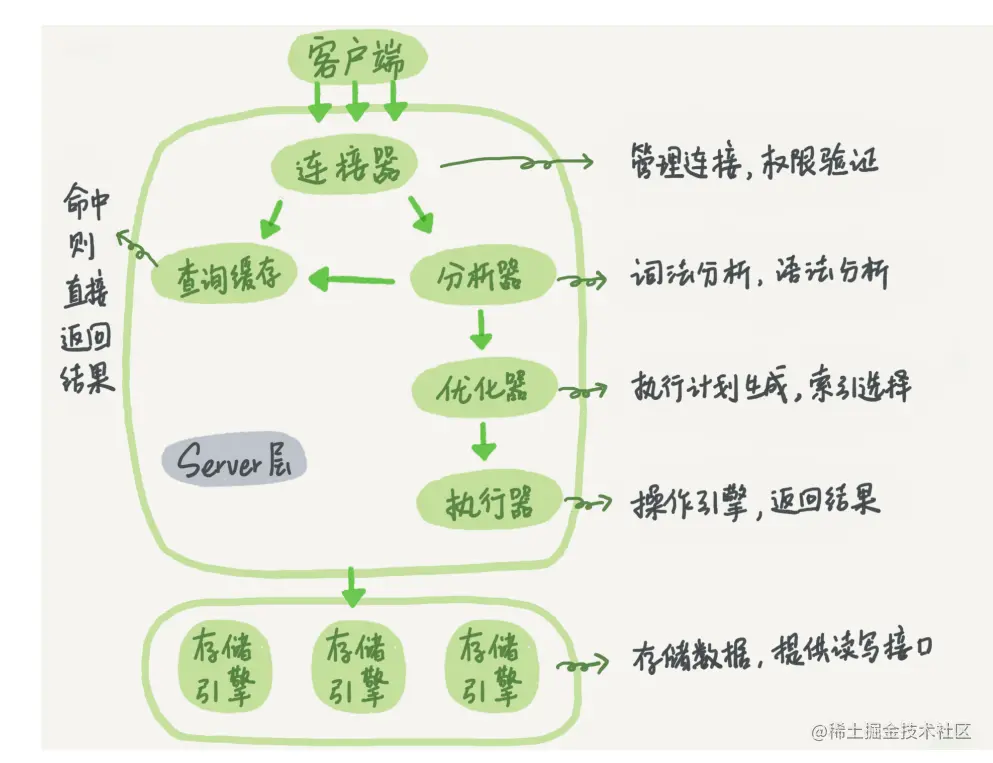 Server层包括连接器,分析器,优化器,执行器等,涵盖了MySql大部分的核心功能,以及所有的内置函数(日期,时间..)除此之外还包括跨引擎的功能,触发器,存储过程,视图等