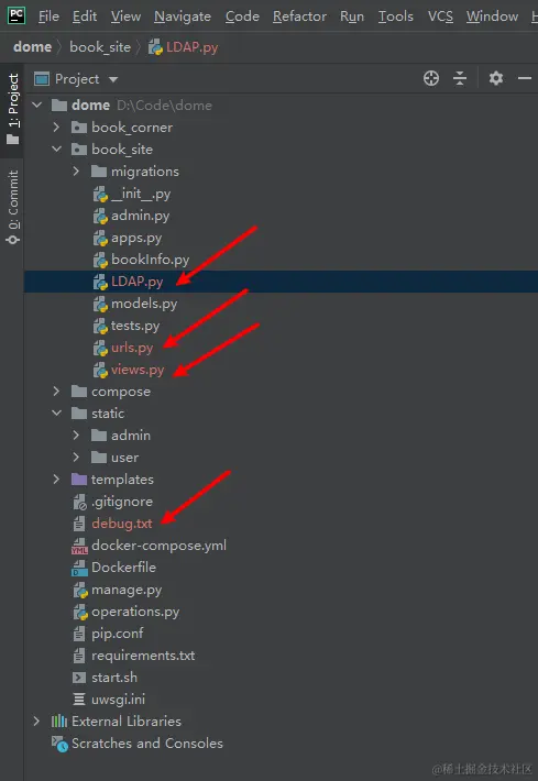 如果有冲突文件,使用 IDE 解决冲突。使用 Pycharm 打开项目,发现标红的文件都是有冲突的文件。