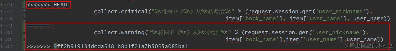 下图中下面一行是合并的目标分支 dev_wxx 代码,上面一行是 dev_yxx 分支代码,我选择删掉两个红框里的冲突代码。