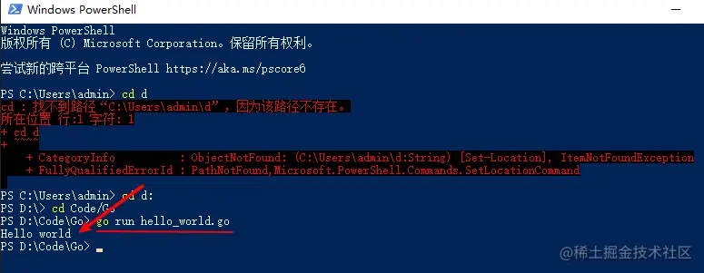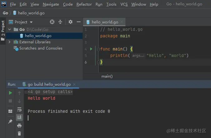 然后打开之前那个 hello_world.go 文件,运行,成功输出结果。