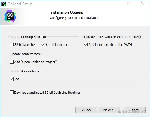 这里勾选了 64-bit launcher、Add launchers dir to the PATH、.go 三个。分别是创建桌面快捷方式 64 位、更新 PATH 环境变量、关联 .go 后缀文件。