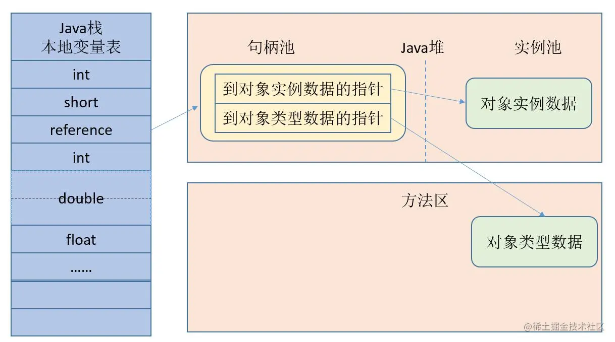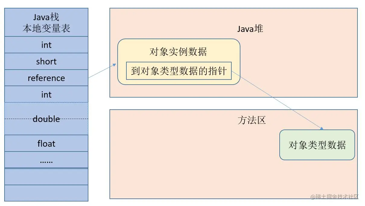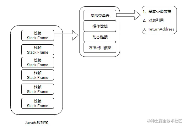 主要存放了基本类型数据、对象引用(reference类型,它不同于对象本身,可能是一个指向对象起始地址的引用指针,也可能是指向一个代表对象的句柄或其他与此对象相关的位置)和 returnAddress 类型(指向了一条字节码指令的地址)。