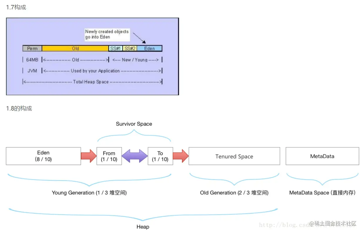 - 年轻代 : 常常又被划分为Eden区和Survivor(From Survivor To Survivor)区(Eden空间、From Survivor空间、To Survivor空间(空间分配比例是8:1:1)