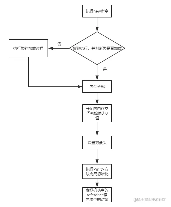 执行 init 方法: 在上面工作都完成之后,从虚拟机的视角来看,一个新的对象已经产生了,但从 Java 程序的视角来看,对象创建才刚开始, 方法还没有执行,所有的字段都还为零。所以一般来说,执行 new 指令之后会接着执行 方法,把对象按照程序员的意愿进行初始化,这样一个真正可用的对象才算完全产生出来。