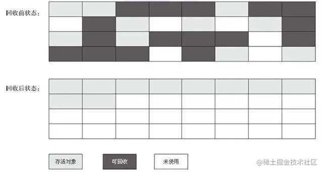 根据老年代的特点特出的一种标记算法,标记过程仍然与“标记-清除”算法一样,但后续步骤不是直接对可回收对象回收,而是让所有存活的对象向一端移动,然后直接清理掉端边界以外的内存。