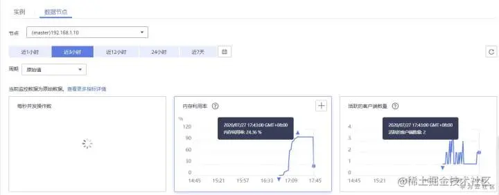 查看节点的内存监控。其中分片2中master节点192.168.1.10内存使用率达到100%,其余两个分片分内存使用率均在20%左右,结果如下图所示: