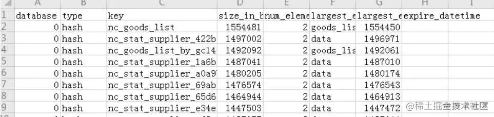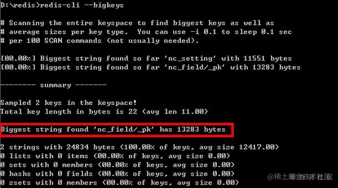 可以得出该环境中string类型的大key为“nc_filed/_pk”,大小为13283byte,list、set、hash、zset类型的数据未发现大key。