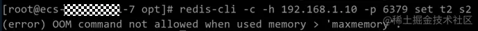 访问Redis 5.0 cluster集群出现OOM报错,报错信息为(error) OOM command not allowed when used memory > ‘maxmemory’,部分ECS应用程序无法向数据库写入,影响服务的正常使用。执行set t2 s2时,数据库报错OOM,如下图: