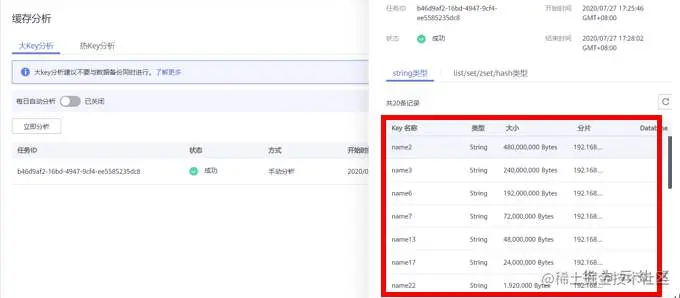 ① 工具分析:使用华为云管理控制台缓存分析-大Key分析工具。执行完成后,查看信息即可。结果如下图所示:(string类型保存top20,list/set/zset/hash类型保存top80)