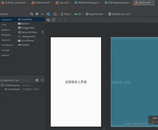 activity_main总体布局文件就由include函数来引用顶部和底部的布局文件top和bottom(这是id)。然后中间的Frame就将fragment布局显示在页面的中间。下面是配置源码: