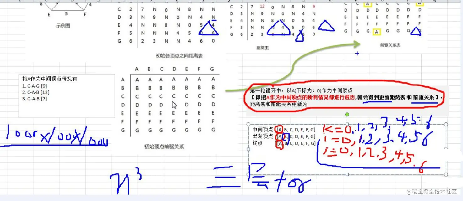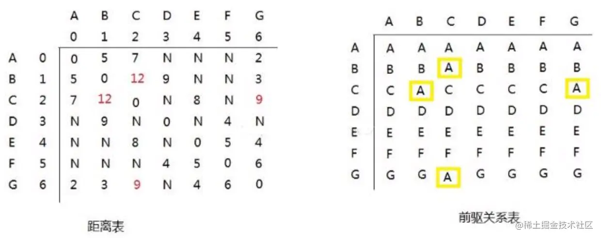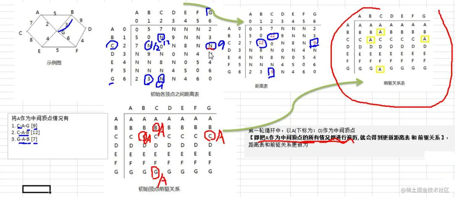 - 以 A 顶点作为中间顶点是,B->A->C 的距离由 N->9,同理 C 到 B;C->A->G 的距离由 N->12,同理 G 到 C
