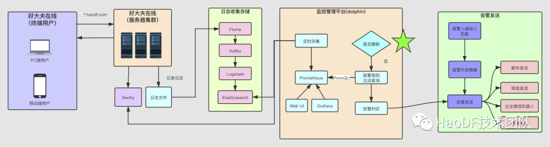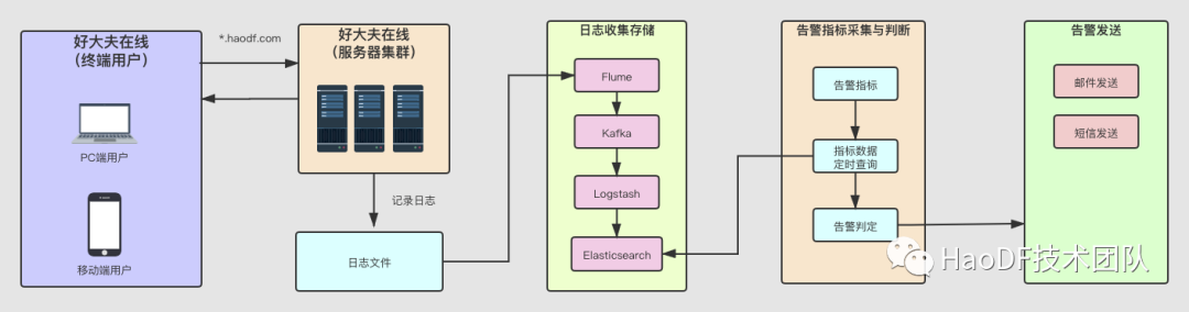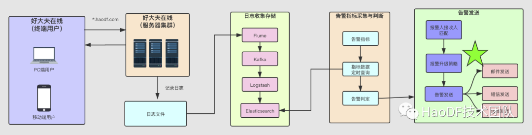 **工程师小黄:**当用户请求到好大夫在线的服务器之后,会产生相应的日志。比如Nginx会有access.log,程序会记录locallog(自定义日志)和tracelog(分布式调用栈日志)等,然后对日志进行收集和存储,最后定时查询告警指标,判断是否要告警,如果要告警,通过邮件和短信进行发送。